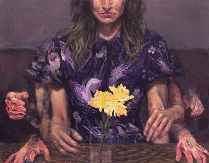 A living artist working out of NYC. His brushwork combines non-traditional paint applications, printmaking, and stamps, for example, to communicate the artist’s personal experiences in living with obsessive-compulsive disorder and the rituals that make the days.