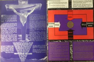 “Robert’s vision convinced him that people were divided into four types, based on the four god forces. Each was an extreme, and the idea was to discover which path suited you and to follow it whole-heartedly. Jehovans were disciplined, authoritarian, ascetic puritans (Mary Ann was a classic example). Satanists were dedicated to violence, chaos and lust. Lucifereans were self-indulgent sensualists (the most popular type in the 1960s, I’d imagine). Christ, as unifier of all three, was the symbol of the new man to emerge after the coming destruction. All the rest were what DeGrimston called ‘The Greys,’ the great mass of lukewarm mediocrities, who take the safe path of compromise and conformity. John Grey “hides, even from himself, his own intensity of feeling” and “has wrapped himself in a cocoon of compromise and mediocrity.” People like him would burn in the purging fires of the last days – which, according to DeGrimston, were soon approaching.”